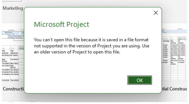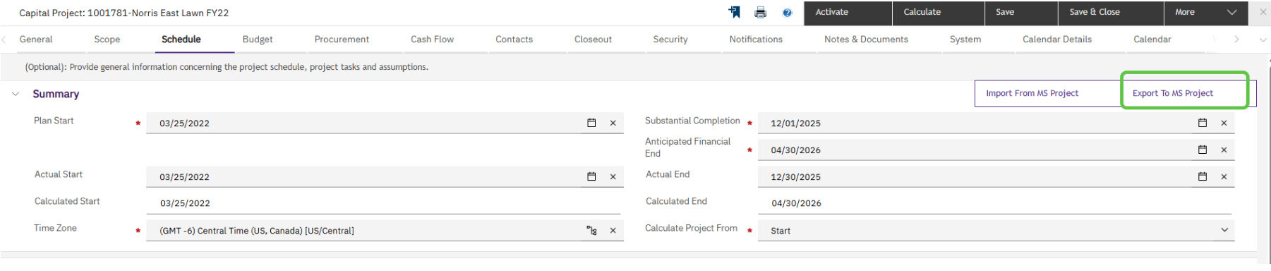 From a Capital Project, Schedule tab, Summary section, clicking 'Export to MS Project', the format of the project file is so old it is no longer supported (MPX).  The other format type of 'XML' is still useful but requires more steps to import into Microsoft Project.  For reference we're currently using the Microsoft 365 Project version on a windows desktop.  Our research indicates that the MPX format is from MS Project 2013 or later.
