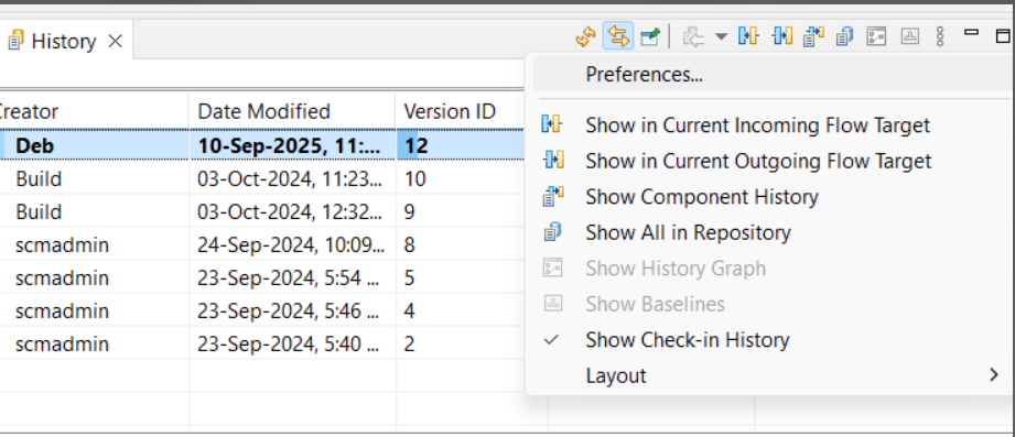 The EWM Ideas Review board has reviewed this request. By default, the history view fetches and shows the last 100 history entries; this has been done to keep the operation in the Eclipse UI performant. There is a user preference in the history view where this limit is defined. The user can change this limit if they s/he want more history entries to appear in view. We request that you try this option to meet this request. Please refer to screenshots provided.