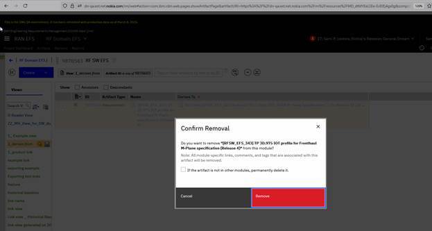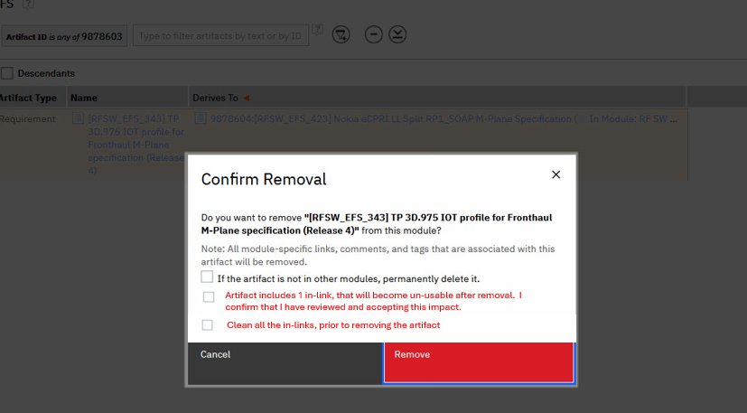 When users click remove Module artifact, the error message has tick box and warning what is about to happen - delete Module and all its artifacts. However, it would be good to have check if Module Artifacts have any in-links, since if delete is done, these in-links become corrupted from the other end of the link - leading to deleted Artifact. These links need to be found and removed manually, which is very time consuming.