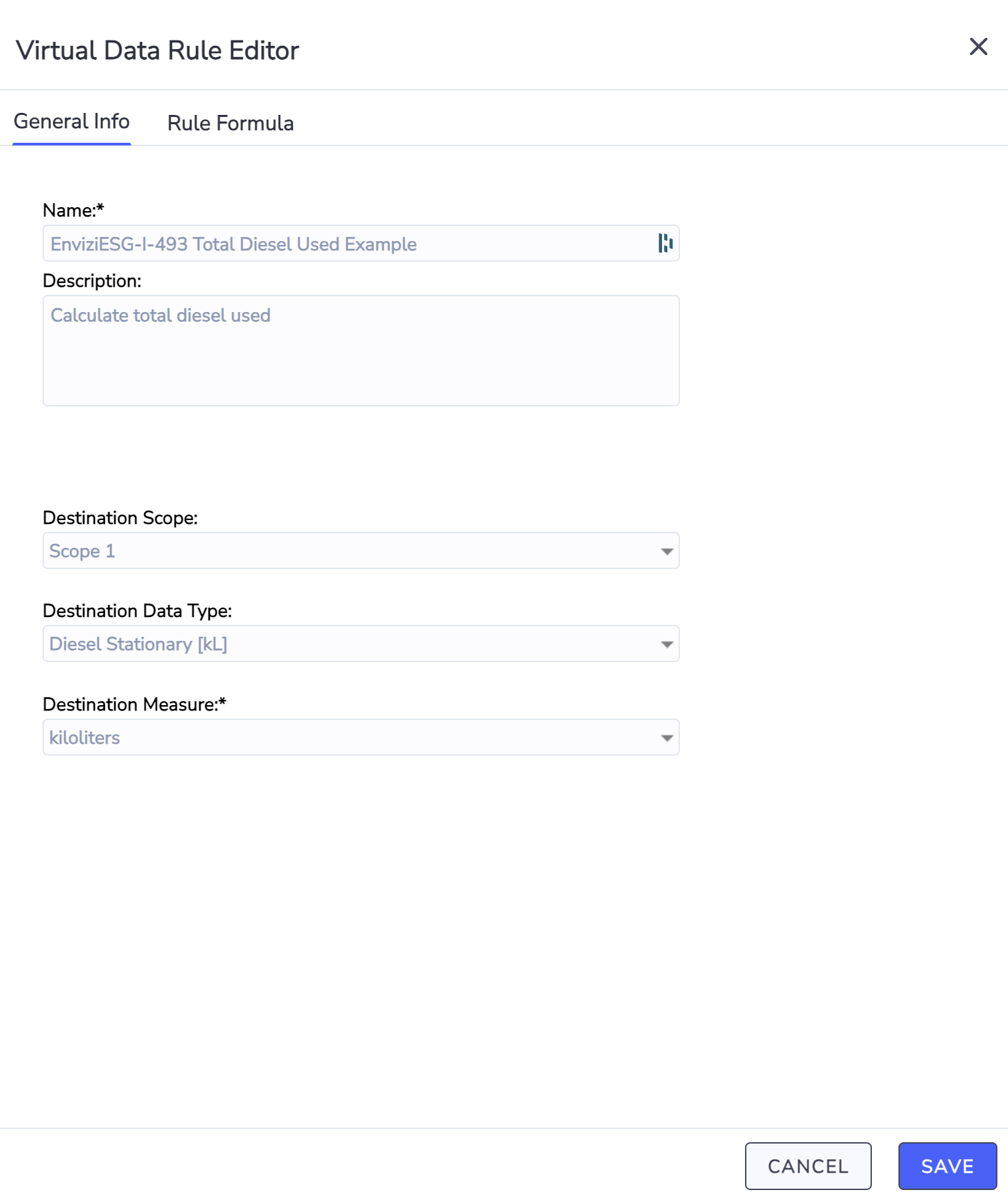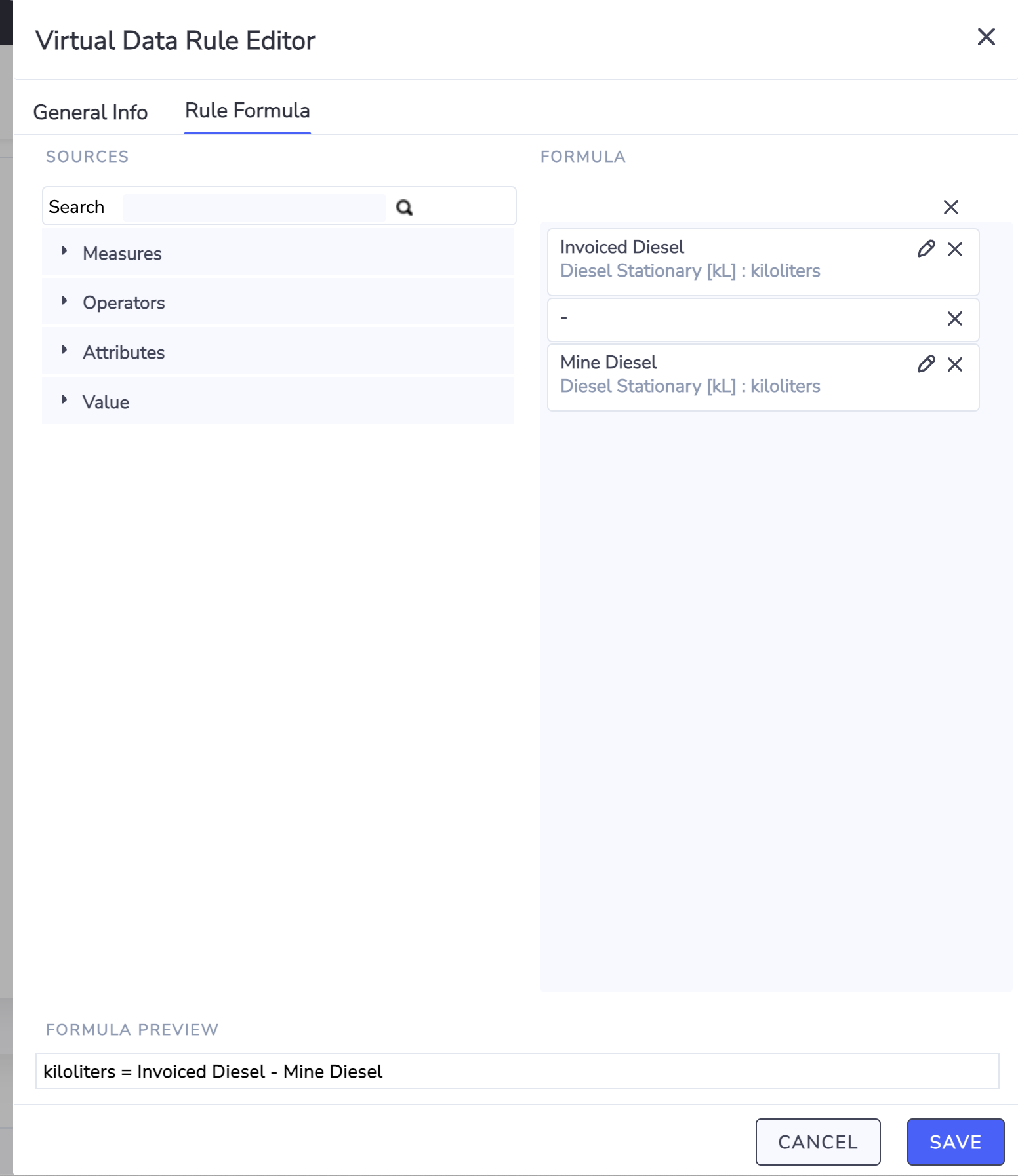 Also, it is already possible to create formulas that have multiple variables from the same data type. Using your Diesel example I have configured a sample rule in your instance to illustrate how this would be done. The rule is called "EnviziESG-I-493 Total Diesel Used Example". This rules uses the Diesel Stationary [kL] data type for both variables in the formula and subtracts KL of Diesel from KL of Diesel. When you create the virtual account you simply nominate the Total Invoiced Diesel account to fill the first variable and the Mine Diesel to fill the second variable. This then gives you the Total used as you desire.