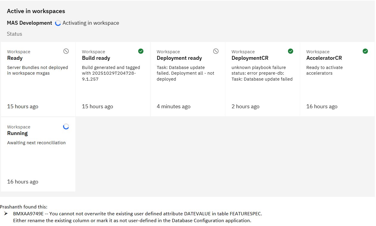 We got stuck on the deployment screen for a while, because we weren't aware there was a backend database-validation check that the upgrade process had detected that was blocking the upgrade.  The open shift team had to help find that error message in their logs, but our team (mas/manage team) couldn't see that error detail; would've saved us time instead of waiting for the upgrade to advance when it was actually stuck.
